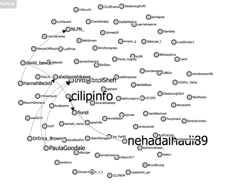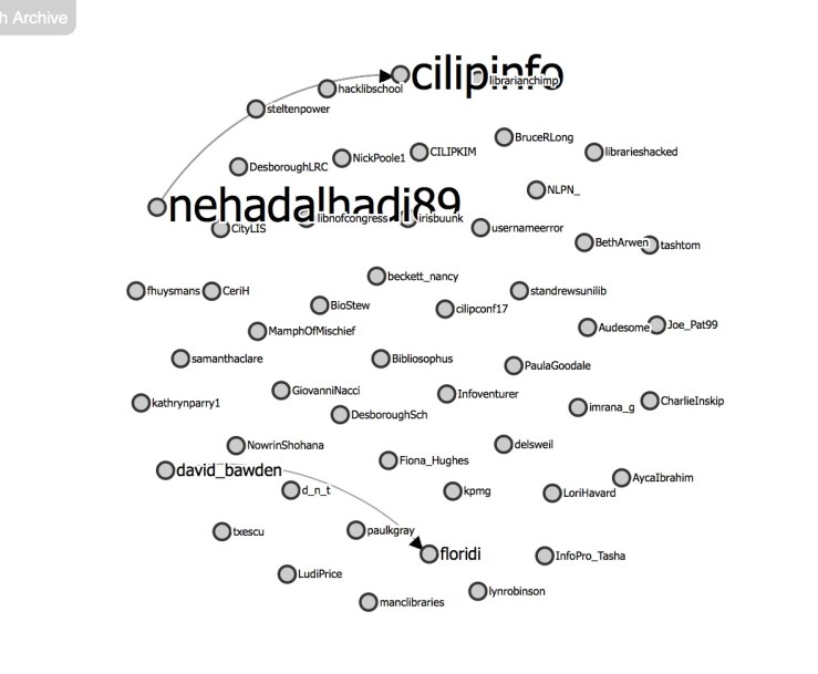 The same can be done using a twitter username, as in the display below, created by entering ‘@floridi’ and ‘#CILIPconf17’ to find tweets mentioning Luciano Floridi who gave a keynote talk. Again the lines join those who interact, the size of the name showing the extent of interaction, with the isolated usernames being those who simply mention Floridi.