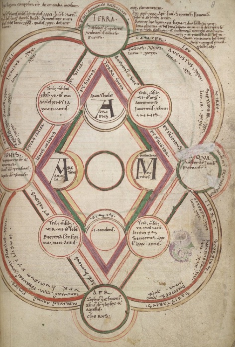 Among the many wonderful things on display at the recent Anglo-Saxon Kingdoms exhibition at the British Library was the intriguing image known as Byrhtferth’s diagram. The version of the diagram on display was from the British Library’s own manuscript collection (Harley MS3667). Although stunning, it is somewhat incomplete: St John’s College, Oxford, has a slightly different version (MS 17).