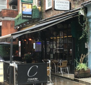 Located in Cosmo Place, between Southampton Row and Queen Square in Bloomsbury, the Cosmoba restaurant has been run by the same family for several decades. It serves a varied clientele of locals, tourists from the nearby hotels, visitors to the nearby British Museum, and academics from the University of London.