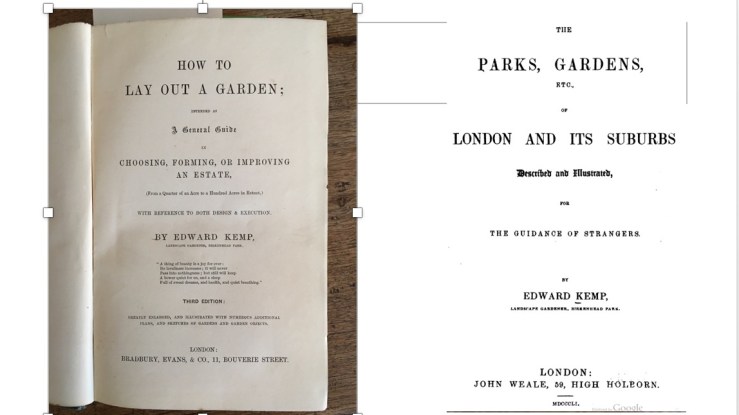He was, however, also an influential and best-selling author. His How to Lay out a Garden, running into several editions, is the best known and most influential of his written works, being widely read in America and Australia. There were others, notably editions of the Hand-Book of Gardening, and his Parks, Gardens etc. of London and its Suburbs, the first ever such regional survey. He assisted Joseph Paxton with the editing of his publications, both magazines, notably the Magazine of Botany, and books, and was a regular and thoughtful contributor to magazines, most notably the Gardeners’ Chronicle. Together with John Gibson and Edward Milner, he was one the protégées of Joseph Paxton, who, alongside their mentor, did so much for the dissemination of horticultural knowledge, as authors, editors and compilers, in the midst of the nineteenth century communications revolution. They played a major part in establishing Victorian horticulture and landscape design, and conveyed their ideas to a wide public, through the newest technologies for communicating useful information. Kemp’s main publishers, Bradbury and Evans, were among the most advanced printing firms, making full use of the new steam printing presses